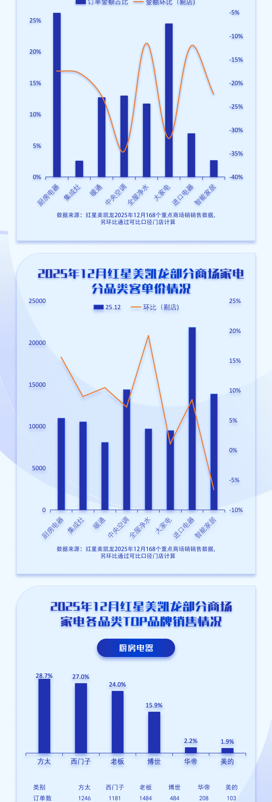 根据奥维云网(AVC)的监测数据,到了2025年12月,红星美凯龙的重点商场零售额达到了19929万元,订单数量为18707单。其客单价超过了线下家电零售市场的平均水平,达到了4349元。同时,数据显示红星美凯龙在2025年12月的家电产品溢价指数为2.4,套购指数为3.1。具体分析,各个品类中,全屋净水和进口家电的零售金额环比增长幅度最大,此外,全屋净水和厨房电器的客单价也显示出显著的环比增长。