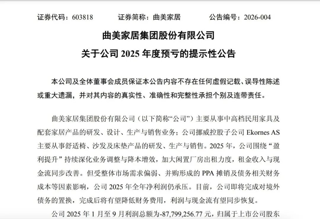 曲美家居:公司2025年度经营业绩将出现亏损